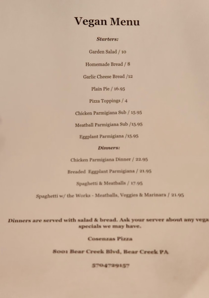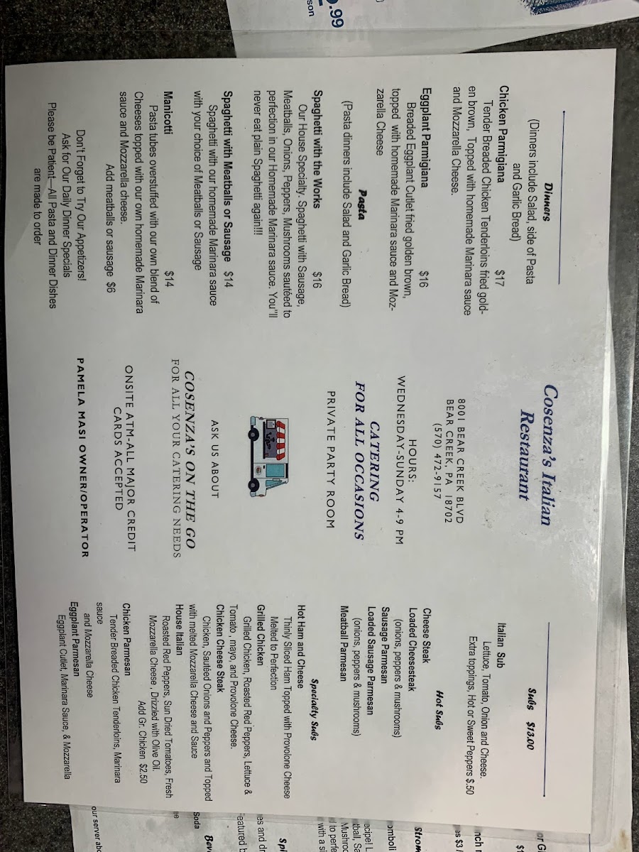 Introducing the menu at Cosenza, located in the scenic Bear Creek Village, PA, is a delightful experience for food lovers. Known for its mouthwatering offerings, Cosenza presents a variety of dishes that cater to diverse tastes, including delicious vegan options. Begin your meal with a Garden Salad or Garlic Cheese Bread before diving into hearty Cold Subs like the Loaded Cheesesteak or Chicken Parmigiana Sub for just $15.95.